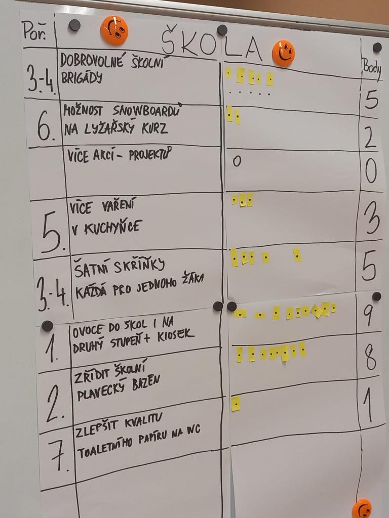 Zástupci tříd 5. až 9. ročníku se zamýšleli na tím, co se jim ve škole líbí a nad tím, jaké cesty by mohly vést k dalšímu zlepšení prostředí. Po prezentaci svých nápadů hlasovali o nejzajímavějších bodech. Stejnou cestou se pak v druhém bloku věnovali problematice města a nápadům k jeho vylepšení. Prozradíme, že nápady vzešlými z dnešního přemýšlení a rokování se budeme dále zabývat.